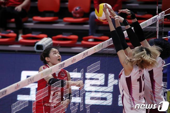 (광주=뉴스1) 황희규 기자 = 19일 오후 광주 서구 화정동 염주종합체육관에서 열린 프로배구 '2021-22시즌 도드람 V리그' 여자부 페퍼저축은행과 KGC인삼공사의 경기에서 페퍼저축은행 박경현의 공격이 블로킹에 가로막히고 있다. 2021.10.19/뉴스1