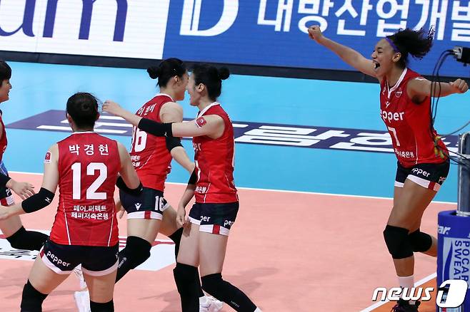 (광주=뉴스1) 황희규 기자 = 19일 오후 광주 서구 화정동 염주종합체육관에서 열린 프로배구 '2021-22시즌 도드람 V리그' 여자부 페퍼저축은행과 KGC인삼공사의 경기에서 페퍼저축은행 선수들이 첫 득점을 한 뒤 기뻐하고 있다. 2021.10.19/뉴스1