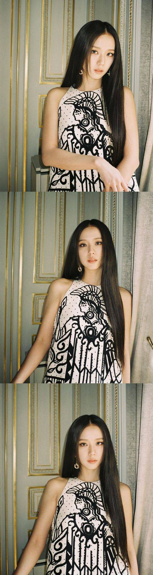 공개된 사진은 원피스를 입고 포즈를 취하고 있는 지수의 모습. 지수가 입은 옷은 그녀가 프랑스 파리 패션위크의 디올쇼에 참석할 때 입었던 옷으로 여리여리한 지수의 몸매와 작은 얼굴이 특히나 돋보인다.