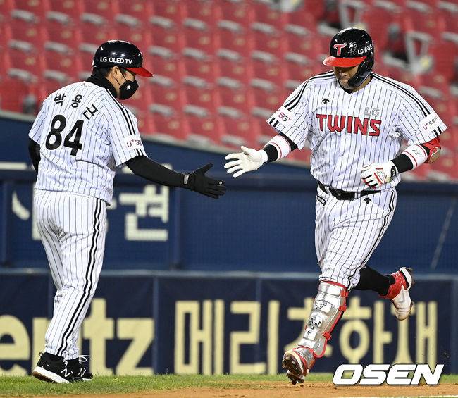 5회말 2사 주자없는 상황 LG 유강남이 추격의 좌월 솔로포를 날리고 그라운드를 돌며 박용근 코치와 인사를 나누고 있다. / dreamer@osen.co.kr