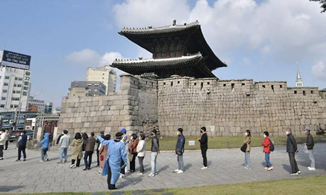 | 동대문시장 집단감염에 선별진료소 긴 줄 동대문종합시장의 코로나19 집단감염 확산세가 지속하는 가운데 19일 서울 종로구 흥인지문 인근에 설치된 찾아가는 선별진료소에 코로나19 검사를 받으려는 시민들이 줄 서 있다. 하상윤 기자 |