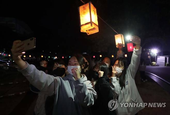 (창원=연합뉴스) 김동민 기자 = 2022학년도 대학수학능력시험이 한 달 앞으로 다가온 19일 오후 경남 창원시 마산합포구 완월동 성지여자고등학교에서 열린 '수능 대박·대학 합격 점등식'에서 고3 수험생들이 점등 아래서 기념 촬영하고 있다. 2021.10.19