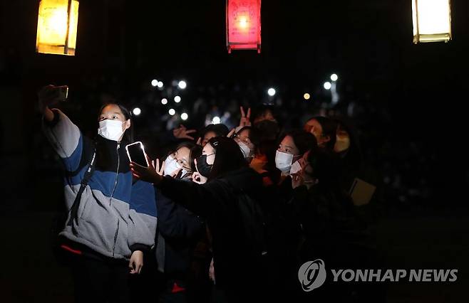 (창원=연합뉴스) 김동민 기자 = 2022학년도 대학수학능력시험이 한 달 앞으로 다가온 19일 오후 경남 창원시 마산합포구 완월동 성지여자고등학교에서 열린 '수능 대박·대학 합격 점등식'에서 고3 수험생들이 점등 아래서 기념 촬영하고 있다. 2021.10.19