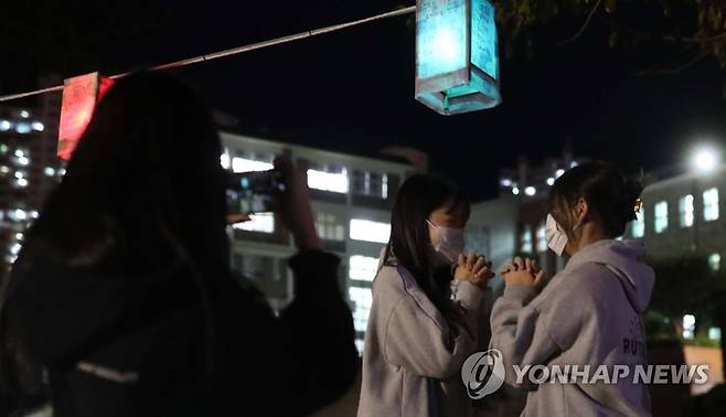 (창원=연합뉴스) 김동민 기자 = 2022학년도 대학수학능력시험이 한 달 앞으로 다가온 19일 오후 경남 창원시 마산합포구 완월동 성지여자고등학교에서 열린 '수능 대박·대학 합격 점등식'에서 학생들이 기도하고 있다. 2021.10.19