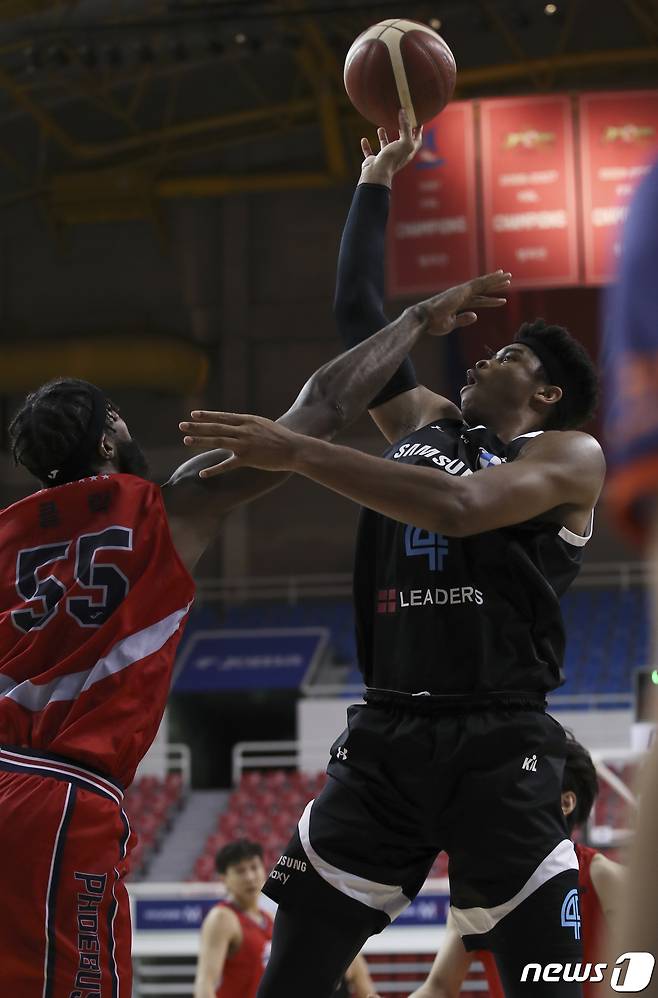 (울산=뉴스1) 윤일지 기자 = 19일 오후 울산 동천체육관에서 열린 '2021-2022 KGC인삼공사 정관장 프로농구' 울산 현대모비스와 서울 삼성의 경기에서 삼성 아이제아 힉스가 현대모비스 얼 클락을 피해 슛하고 있다. 2021.10.19/뉴스1
