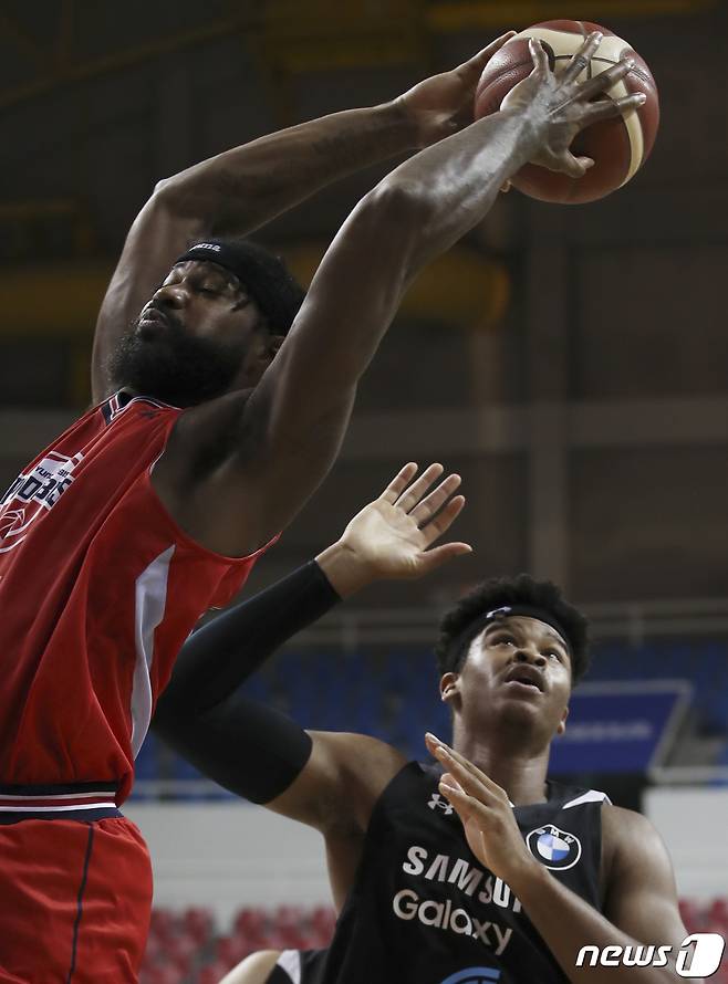 (울산=뉴스1) 윤일지 기자 = 19일 오후 울산 동천체육관에서 열린 '2021-2022 KGC인삼공사 정관장 프로농구' 울산 현대모비스와 서울 삼성의 경기에서 현대모비스 얼 클락이 리바운드를 하고 있다. 2021.10.19/뉴스1