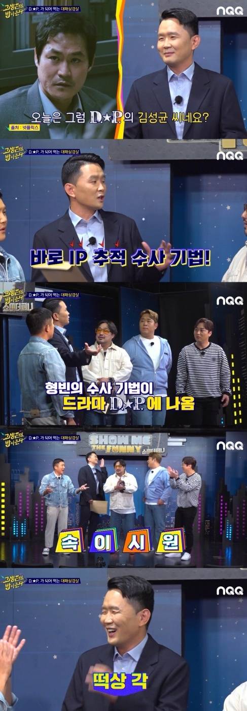 조세호가 “오늘 그럼 D.P.의 김성균 씨 역할이네요?”라고 말하자, 윤형빈은 “정해인 씨 역할인 줄 알았는데, 옷을 이걸 입히더라고...”라며 아쉬워했다. 하지만 황제성이 “윤형빈 형이 복무할 당시에 만들어진 IP 추적 수사 기법이 아직도 쓰이고, 드라마 ‘D.P.’에도 나오더라고”라고 말하자 윤형빈은 어깨를 으쓱하며 자랑스러워했다.