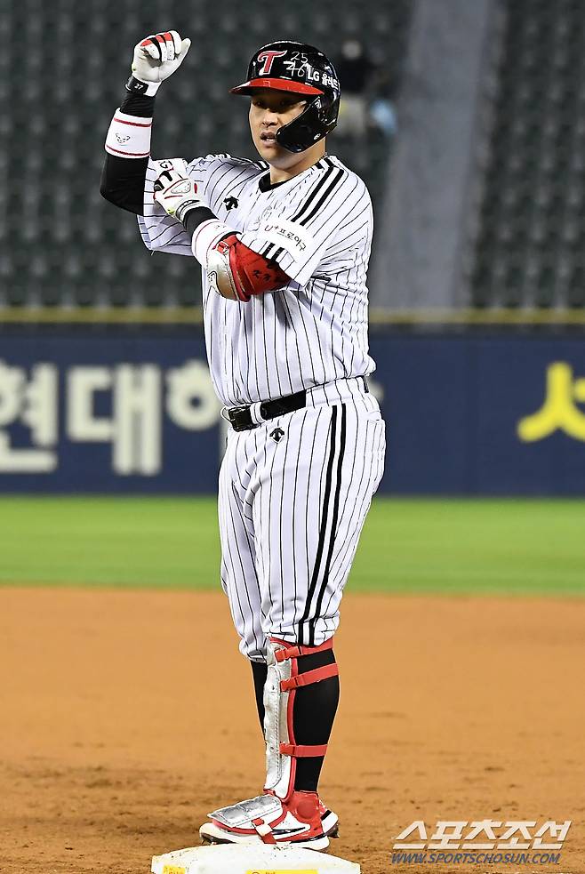 2021 KBO리그 LG 트윈스와 키움 히어로즈의 경기가 19일 잠실구장에서 열렸다. 6회말 1사 1,2루 LG 유강남이 안타를 날린 뒤 환호하고 있다. 잠실=박재만 기자 pjm@sportschosun.com/2021.10.19/