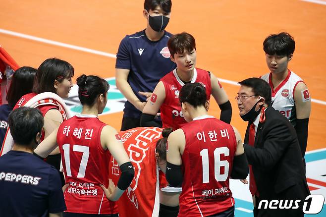 (광주=뉴스1) 황희규 기자 = 19일 오후 광주 서구 화정동 염주종합체육관에서 열린 프로배구 '2021-22시즌 도드람 V리그' 여자부 페퍼저축은행과 KGC인삼공사의 경기에서 페퍼저축은행 김형실 감독이 선수들에게 작전을 지시하고 있다. 2021.10.19/뉴스1