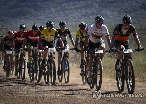 epa09531868 Professional elite riders in action during Stage 2 of the 2021 Absa Cape Epic mountain bike race over 96km including 2,100m of climbing, near Saronsberg, South Africa, 19 October 2021. This years event sees 600 riders tackle 620km over eight days of riding and 15,350m of vertical ascent. The race includes UCI pro riders and amateurs in what is seen by many as the premier MTB stage race in the world. EPA/KIM LUDBROOK