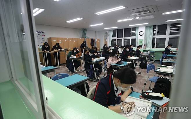 (창원=연합뉴스) 김동민 기자 = 2022학년도 대학수학능력시험이 한 달 앞으로 다가온 19일 오후 경남 창원시 마산합포구 완월동 성지여자고등학교에서 3학년생들이 야간 자율학습을 하고 있다. 2021.10.19