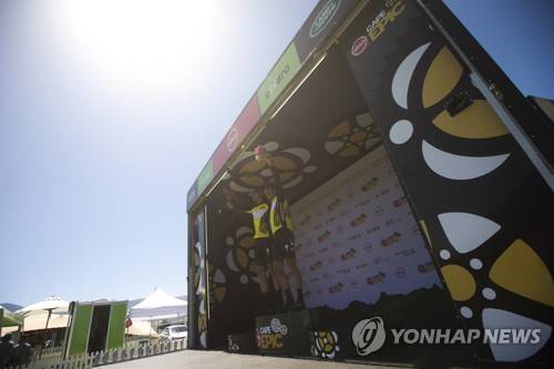 epa09531872 Race leaders NinetyOne-songo-Specialized riders Jordan Sarrou (R) of France and Matt Beers (L) of South Africa celebrate on the podium after retaining the leaders yellow jersey and winning Stage 2 of the 2021 Absa Cape Epic mountain bike race over 96km including 2,100m of climbing, near Saronsberg, South Africa, 19 October 2021. This years event sees 600 riders tackle 620km over eight days of riding and 15,350m of vertical ascent. The race includes UCI pro riders and amateurs in what is seen by many as the premier MTB stage race in the world. EPA/KIM LUDBROOK