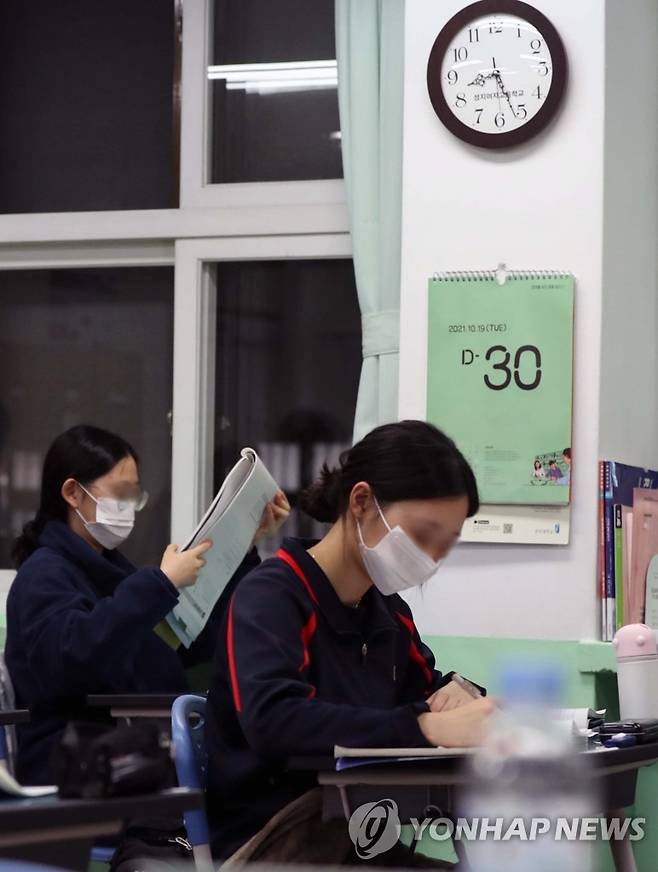 (창원=연합뉴스) 김동민 기자 = 2022학년도 대학수학능력시험이 한 달 앞으로 다가온 19일 오후 경남 창원시 마산합포구 완월동 성지여자고등학교에서 3학년생들이 야간 자율학습을 하고 있다. 2021.10.19