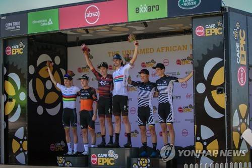 epa09531881 Race leaders NinetyOne-songo-Specialized riders Jordan Sarrou (C-L) of France and Matt Beers (C-R) of South Africa celebrate on the podium after winning Stage 2 of the 2021 Absa Cape Epic mountain bike race over 96km including 2,100m of climbing, near Saronsberg, South Africa, 19 October 2021. This years event sees 600 riders tackle 620km over eight days of riding and 15,350m of vertical ascent. The race includes UCI pro riders and amateurs in what is seen by many as the premier MTB stage race in the world. EPA/KIM LUDBROOK