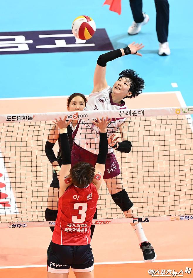 (엑스포츠뉴스 광주, 박지영 기자) 19일 오후 광주광역시 풍암동 염주종합체육관에서 열린 '2021-2022 도드람 V리그' 여자부 페퍼저축은행과 KGC인삼공사의 경기, KGC인삼공사 이소영이 공격을 시도하고 있다.