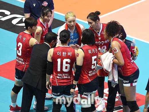 [마이데일리 = 광주 유진형 기자] AI 페퍼스가 19일 오후 광주광역시 페퍼 스타디움에서 진행된 '2021-2022 도드람 V리그' AI 페퍼스와 KGC 인삼공사의 경기에서 화이팅을 외치고 있다.
