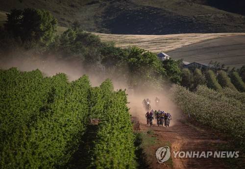 epaselect epa09531764 Professional elite riders descend on a dirt road through vineyards during Stage 2 of the 2021 Absa Cape Epic mountain bike race over 96km including 2,100m of climbing, near Saronsberg, South Africa, 19 October 2021. This years event sees 600 riders tackle 620km over eight days of riding and 15,350m of vertical ascent. The race includes UCI pro riders and amateurs in what is seen by many as the premier MTB stage race in the world. EPA/KIM LUDBROOK