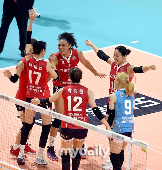 [AI 페퍼스가 19일 오후 광주광역시 페퍼 스타디움에서 진행된 '2021-2022 도드람 V리그' AI 페퍼스와 KGC 인삼공사의 경기에서 1세트를 승리한 뒤 기뻐하고 있다. 사진 = 광주 유진형 기자 zolong@mydaily.co.kr]