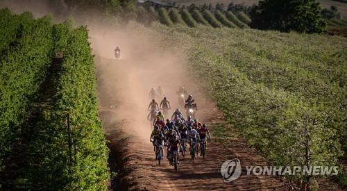 epaselect epa09531883 Professional elite riders descend on a dirt road through vineyards during Stage 2 of the 2021 Absa Cape Epic mountain bike race over 96km including 2,100m of climbing, near Saronsberg, South Africa, 19 October 2021. This years event sees 600 riders tackle 620km over eight days of riding and 15,350m of vertical ascent. The race includes UCI pro riders and amateurs in what is seen by many as the premier MTB stage race in the world. EPA/KIM LUDBROOK