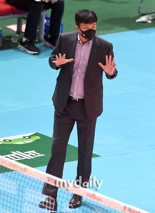 [마이데일리 = 광주 유진형 기자] KGC 인삼공사 이영택 감독이 19일 오후 광주광역시 페퍼 스타디움에서 진행된 '2021-2022 도드람 V리그' AI 페퍼스와 KGC 인삼공사의 경기에서 선수들을 격려하고 있다.