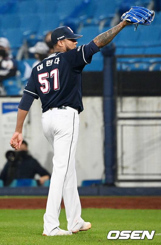 7회말을 마친 두산 선발 미란다가 기뻐하며 덕아웃으로 향하고 있다. 2021.10.19 / rumi@osen.co.kr