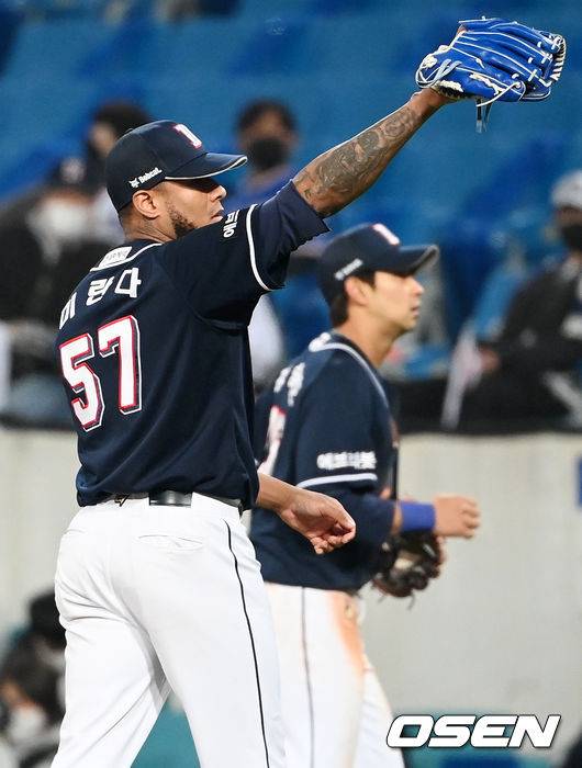 7회말을 마친 두산 선발 미란다가 기뻐하며 덕아웃으로 향하고 있다. 2021.10.19 / rumi@osen.co.kr