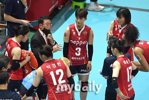 [마이데일리 = 광주 유진형 기자] AI 페퍼스 김형실 감독이 19일 오후 광주광역시 페퍼 스타디움에서 진행된 '2021-2022 도드람 V리그' AI 페퍼스와 KGC 인삼공사의 경기에서 작전을 지시하고 있다.