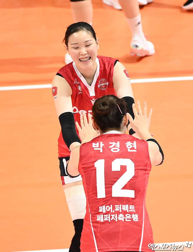(엑스포츠뉴스 광주, 박지영 기자) 19일 오후 광주광역시 풍암동 염주종합체육관에서 열린 '2021-2022 도드람 V리그' 여자부 페퍼저축은행과 KGC인삼공사의 경기, KGC인삼공사 구솔이 팀의 득점에 기뻐하며 박경현과 하이파이브를 나누고 있다.
