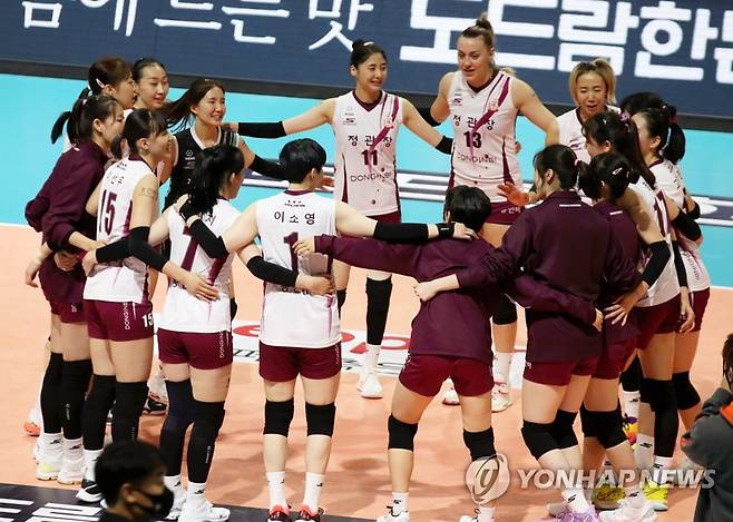 (광주=연합뉴스) 조남수 기자 = 19일 광주 염주종합체육관(페퍼스타디움)에서 열린 프로배구 V리그 여자부 페퍼저축은행 AI페퍼스와 KGC인삼공사의 경기에서 세트스코어 3-1로 역전승을 거둔 KGC인삼공사 선수들이 기뻐하고 있다. 2021.10.19