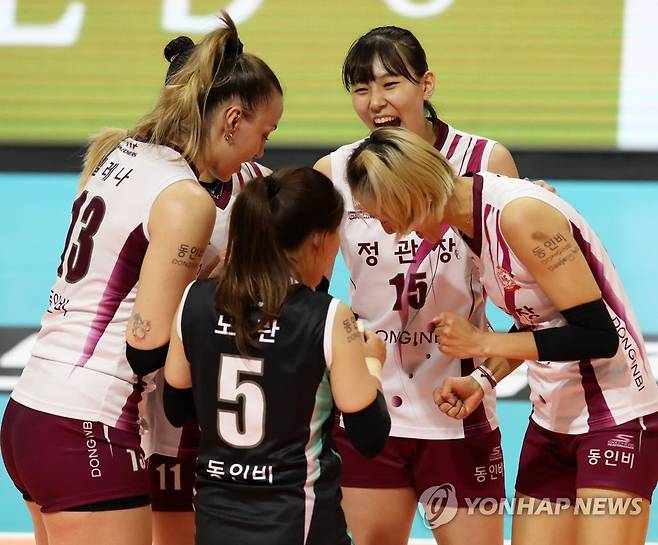 (광주=연합뉴스) 조남수 기자 = 19일 광주 염주종합체육관(페퍼스타디움)에서 열린 프로배구 V리그 여자부 페퍼저축은행 AI페퍼스와 KGC인삼공사의 경기에서 KGC인삼공사 선수들이 4세트에 공격을 성공시킨 뒤 기뻐하고 있다. 2021.10.19