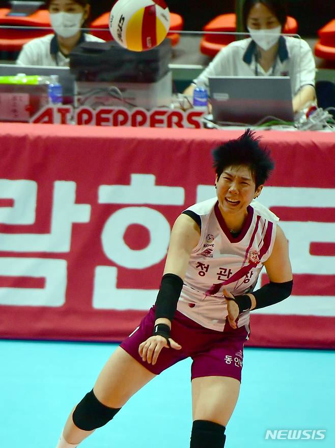 [광주=뉴시스] 류형근 기자 = 19일 오후 광주 서구 페퍼스타디움(염주종합체육관)에서 열린 2021~2022 V-리그 AI페퍼스 대 KGC인삼공사의 경기, KGC인삼공사 이소영이 강력한 서브를 넣고 있다. 2021.10.19. hgryu77@newsis.com