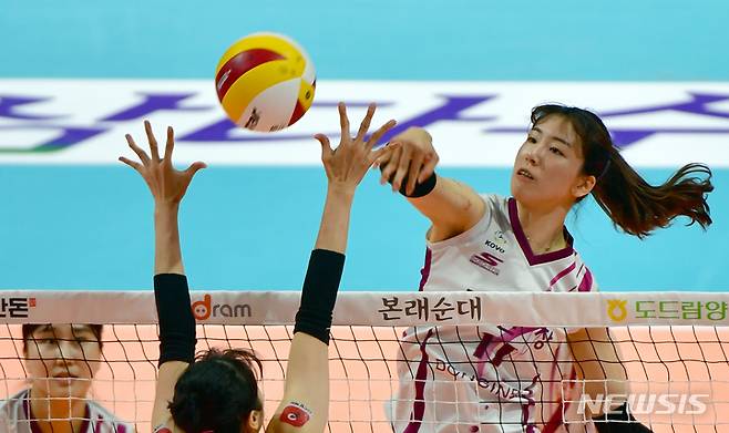 [광주=뉴시스] 류형근 기자 = 19일 오후 광주 서구 페퍼스타디움(염주종합체육관)에서 열린 2021~2022 V-리그 AI페퍼스 대 KGC인삼공사의 경기, KGC인삼공사 정호영이 공격을 하고 있다. 2021.10.19. hgryu77@newsis.com