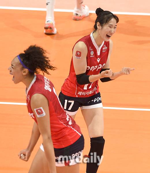 [마이데일리 = 광주 유진형 기자] AI 페퍼스 하혜진이 19일 오후 광주광역시 페퍼 스타디움에서 진행된 '2021-2022 도드람 V리그' AI 페퍼스와 KGC 인삼공사의 경기에서 기뻐하고 있다.