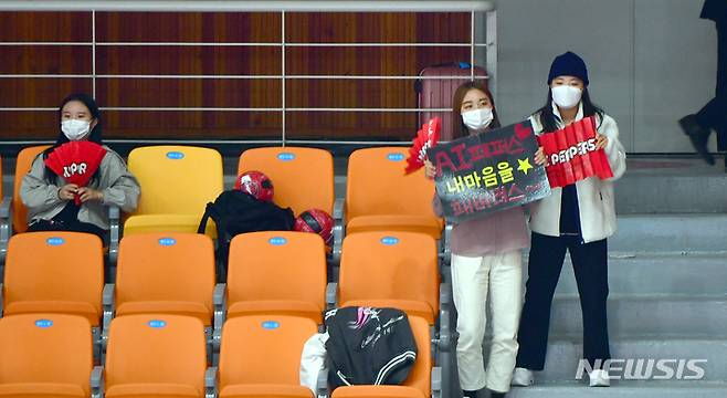 [광주=뉴시스] 류형근 기자 = 19일 오후 광주 서구 페퍼스타디움(염주종합체육관)에서 열린 2021~2022 V-리그 AI페퍼스 대 KGC인삼공사의 경기, AI페퍼스 팬들이 피켓을 들고 응원하고 있다. 2021.10.19. hgryu77@newsis.com