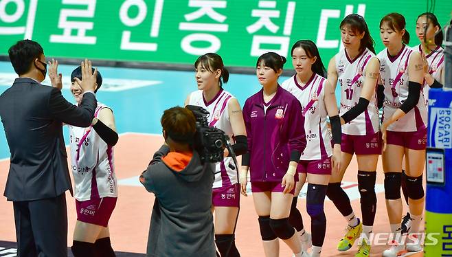 [광주=뉴시스] 류형근 기자 = 19일 오후 광주 서구 페퍼스타디움(염주종합체육관)에서 열린 2021~2022 V-리그 AI페퍼스 대 KGC인삼공사의 경기, KGC인삼공사가 세트스코어 3대 1로 이긴 뒤 기뻐하고 있다. 2021.10.19. hgryu77@newsis.com