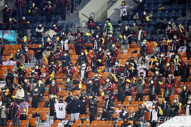 [서울=뉴시스] 배훈식 기자 = 수도권 야구장 관중 입장이 재개된 19일 오후 서울 송파구 잠실야구장에서 열린 2021 KBO리그 LG 트윈스와 키움 히어로즈와의 경기를 찾은 야구 팬들이 열띤 응원을 펼치고 있다. 2021.10.19. dahora83@newsis.com