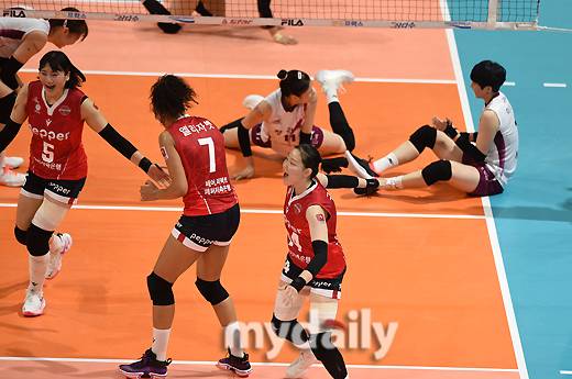 [마이데일리 = 광주 유진형 기자] AI 페퍼스가 19일 오후 광주광역시 페퍼 스타디움에서 진행된 '2021-2022 도드람 V리그' AI 페퍼스와 KGC 인삼공사의 경기에서 기뻐하고 있다.