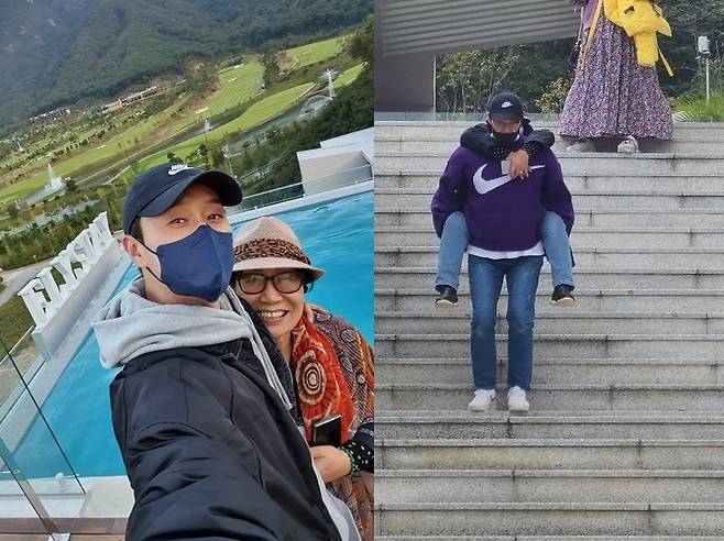 사진 속 김원효는 어머니를 업고 가파른 계단을 내려가는 모습이다. 또 다른 사진에는 손을 맞잡거나 어깨동무하며 함께 와인을 마시는 등 데이트를 즐기는 모자의 모습이 훈훈함을 자아낸다.