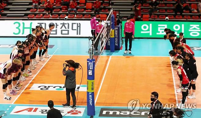 (광주=연합뉴스) 조남수 기자 = 19일 광주 염주종합체육관(페퍼스타디움)에서 열린 프로배구 V리그 여자부 페퍼저축은행 AI페퍼스와 KGC인삼공사의 경기에서 세트스코어 3-1로 역전승을 거둔 KGC인삼공사 선수들(왼쪽)과 페퍼저축은행 선수들이 인사하고 있다. 2021.10.19