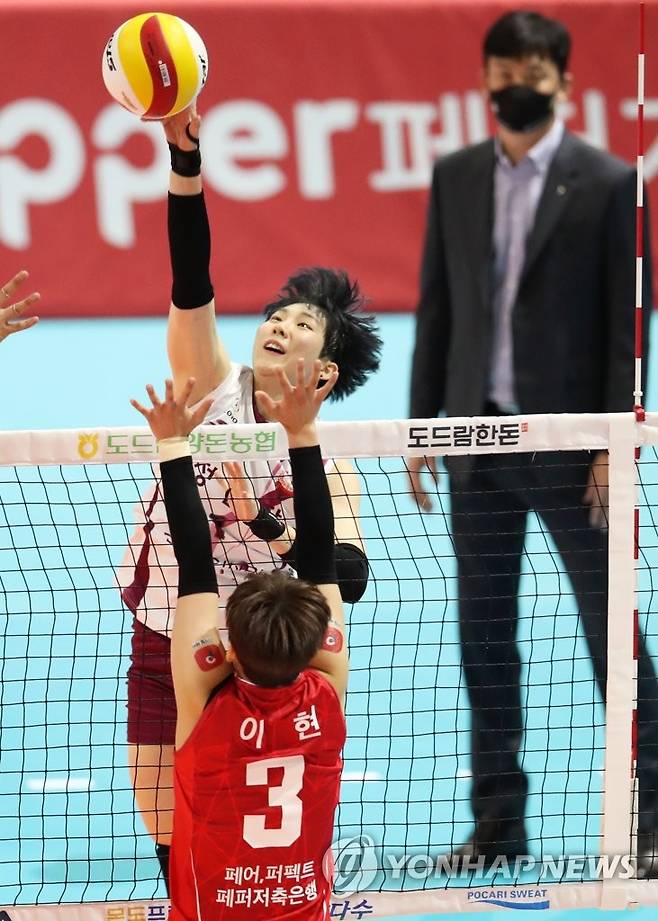 (광주=연합뉴스) 조남수 기자 = 19일 광주 염주종합체육관(페퍼스타디움)에서 열린 프로배구 V리그 여자부 페퍼저축은행 AI페퍼스와 KGC인삼공사의 경기에서 KGC인삼공사 이소영이 페퍼저축은행 이현 앞에서 공격하고 있다. 2021.10.19