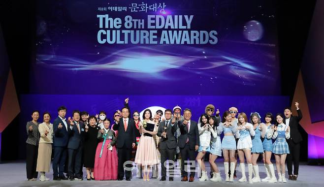 곽재선 이데일리 회장과 대상 수상자인 예주열 CJ ENM 공연사업부장, 배우 전미도를 비롯한 수상자들이 19일 오후 서울 종로구 세종문화회관에서 열린 '제8회 이데일리 문화대상'에서 기념촬영을 하고 있다.