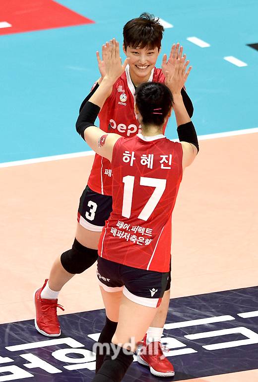 [마이데일리 = 광주 유진형 기자] AI 페퍼스 이현과 하혜진이 19일 오후 광주광역시 페퍼 스타디움에서 진행된 '2021-2022 도드람 V리그' AI 페퍼스와 KGC 인삼공사의 경기에서 기뻐하고 있다.
