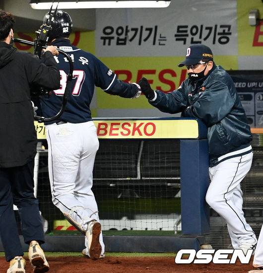 9회초 1사 두산 박건우가 좌중월 솔로 홈런을 날린 후 덕아웃에서 두산 김태형 감독과 하이파이브를 하고 있다. 2021.10.19 / rumi@osen.co.kr