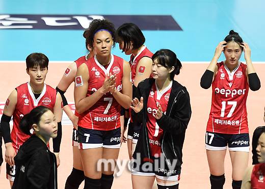 [마이데일리 = 광주 유진형 기자] AI 페퍼스가 19일 오후 광주광역시 페퍼 스타디움에서 진행된 '2021-2022 도드람 V리그' AI 페퍼스와 KGC 인삼공사의 경기에서 세트 스코어 1-3으로 패한 뒤 아쉬워하고 있다.