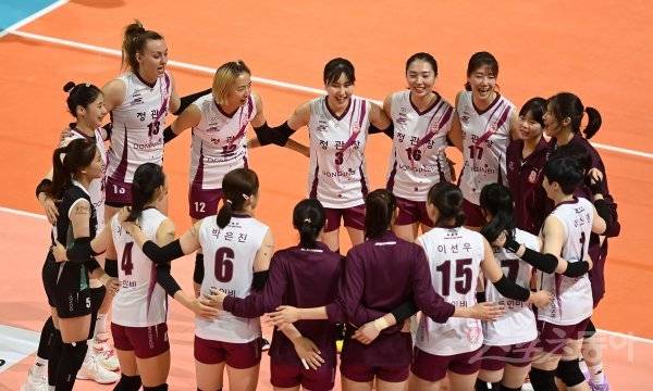19일 광주 염주종합체육관에서 열린 ‘도드람 2021~2022 V-리그’ 여자부 페퍼저축은행과 KGC인삼공사 경기에서 세트스코어 3-1 승리를 거둔 KGC인삼공사 선수들이 기뻐하고 있다.
