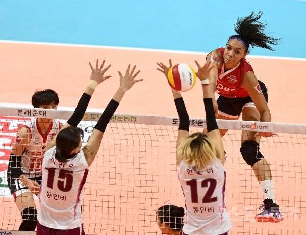 19일 광주 염주종합체육관에서 열린 ‘도드람 2021~2022 V-리그’ 여자부 페퍼저축은행과 KGC인삼공사 경기에서 페퍼저축은행 엘리자벳이 KGC인삼공사의 블로킹 사이로 스파이크 공격을 하고 있다.