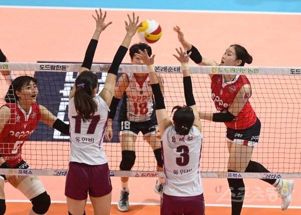 19일 광주 염주종합체육관에서 열린 ‘도드람 2021~2022 V-리그’ 여자부 페퍼저축은행과 KGC인삼공사 경기에서 페퍼저축은행 박경현이 KGC인삼공사의 블로킹 사이로 스파이크 공격을 하고 있다.