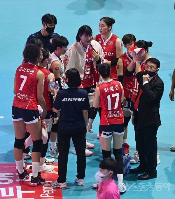 19일 광주 염주종합체육관에서 열린 ‘도드람 2021~2022 V-리그’ 여자부 페퍼저축은행과 KGC인삼공사 경기에서 페퍼저축은행 김형실 감독이 작전 지시를 하고 있다.