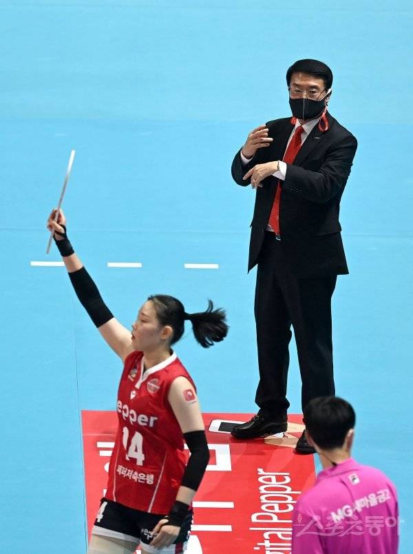 19일 광주 염주종합체육관에서 열린 ‘도드람 2021~2022 V-리그’ 여자부 페퍼저축은행과 KGC인삼공사 경기에서 페퍼저축은행 김형실 감독이 선수를 교체하고 있다.