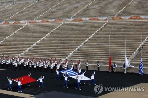 epa09532039 Greek athletes carry the Greek, the Chinese and the Olympic flag during the handover ceremony of the Olympic Flame for the Beijing 2022 Winter Olympics at the Panathenaic Stadium in Athens, Greece, 19 October 2021. EPA/YANNIS KOLESIDIS